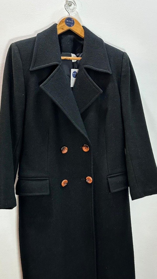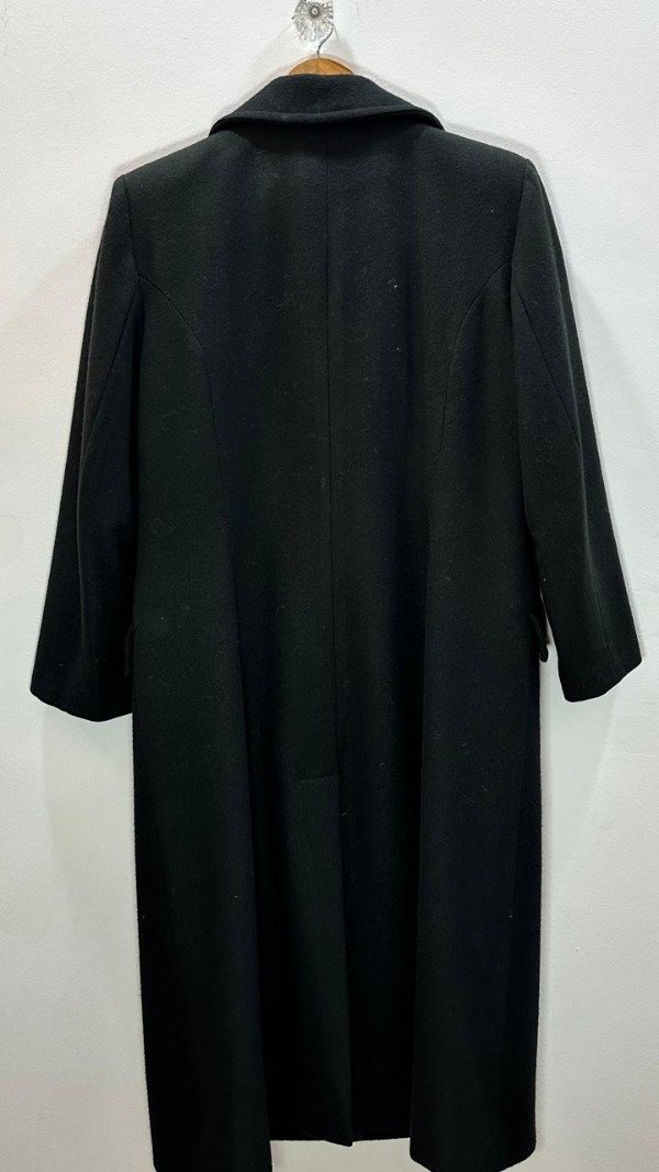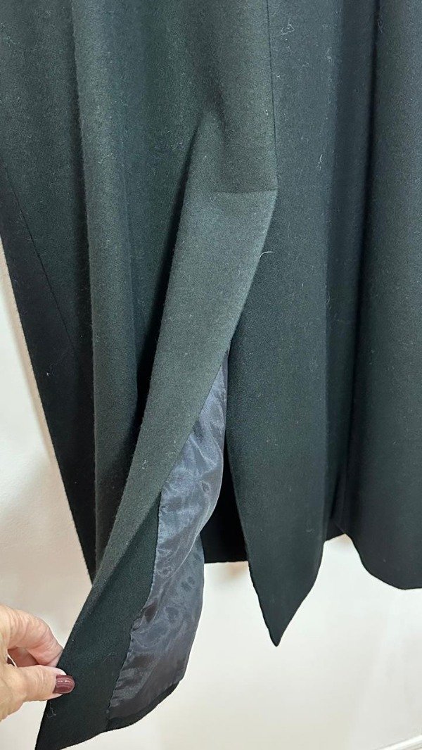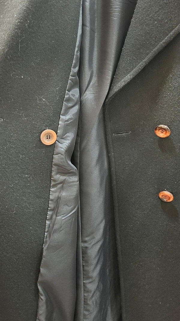 Sobretodo cruzado de paño, bolsillos con tapa y tajo atrás.