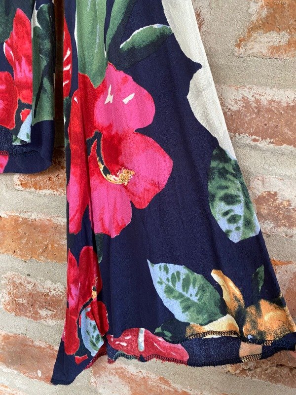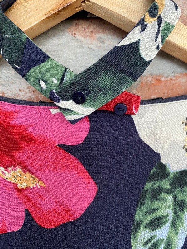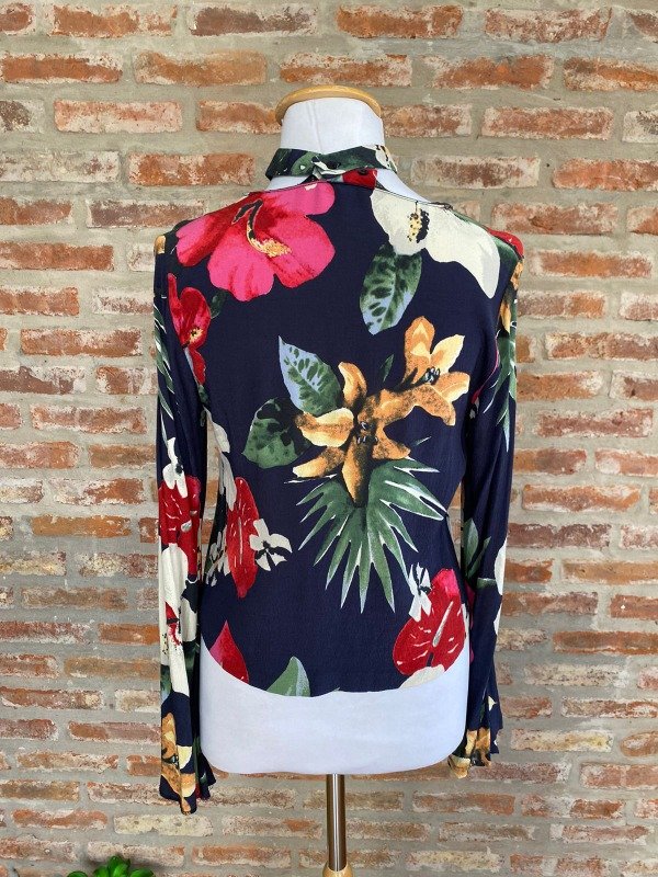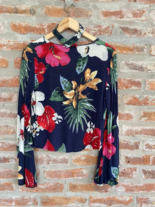 Blusa de crepe azul con estampa de flores gigantes. Escote V y choker que prende atras con botones.